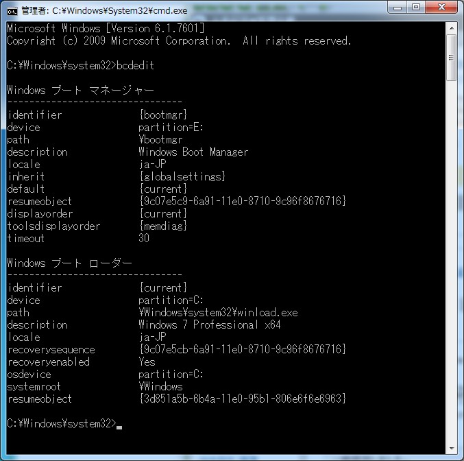BCDEditコマンドの表示結果もWindows7以外のブートは表示されなくなってる。
