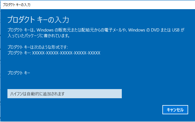 「はい」ボタンで応答し「プロダクトキーの入力」画面を表示します。